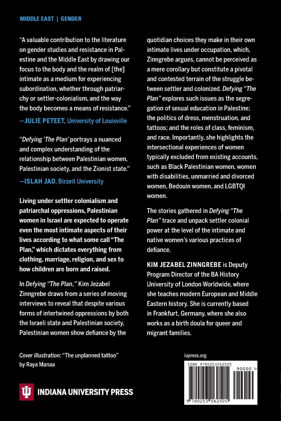 quotidian choices they make in their own intimate lives under occupation, which, Zinngrebe argues, cannot be perceived as a mere corollary but constitute a pivotal and contested terrain of the struggle between settler and colonized. Defying „The Plan“ explores such issues as the segregation of sexual education in Palestine; the politics of dress, menstruation, and tattoos; and the roles of class, feminism, and race. Importantly, she highlights the intersectional experiences of women typically excluded from existing accounts, such as Black Palestinian women, women with disabilities, unmarried and divorced women, Bedouin women, and LGBTQI women.